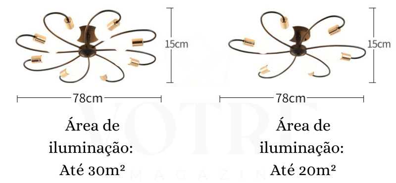 • Área de iluminação: (6 bocais: Até 20 m² e 8 bocais: Até 30 m²)